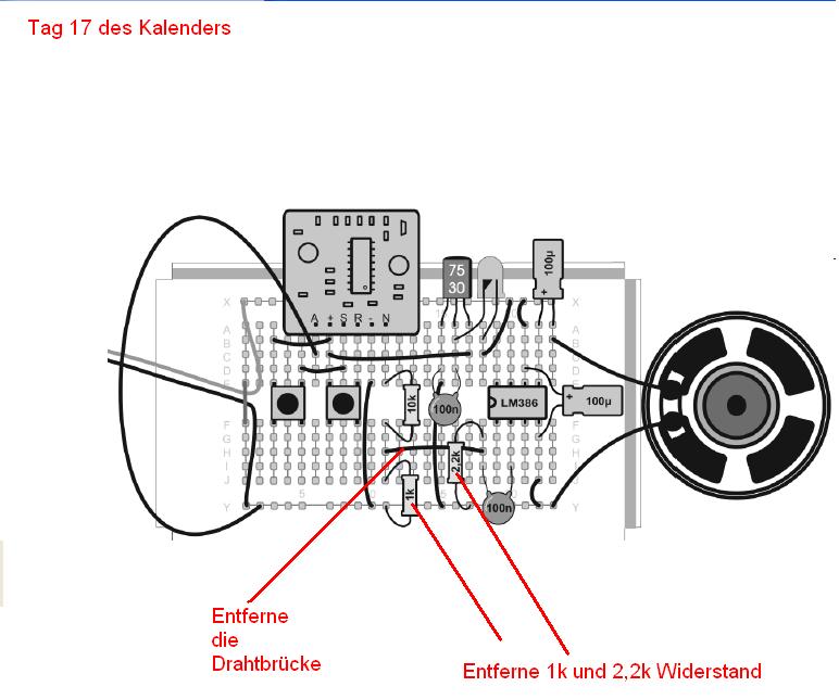 Der 10k Widerstand in Deinem Radio muss unbedingt drin bleiben, das Poti kommt nun an die Stelle, an der Du die Lautstärke mit den unterschiedlichen Widerständen verändern kannst. Vergleiche das oben gezeigte Schaltbild mit dem Plan aus dem Radiokalender.
