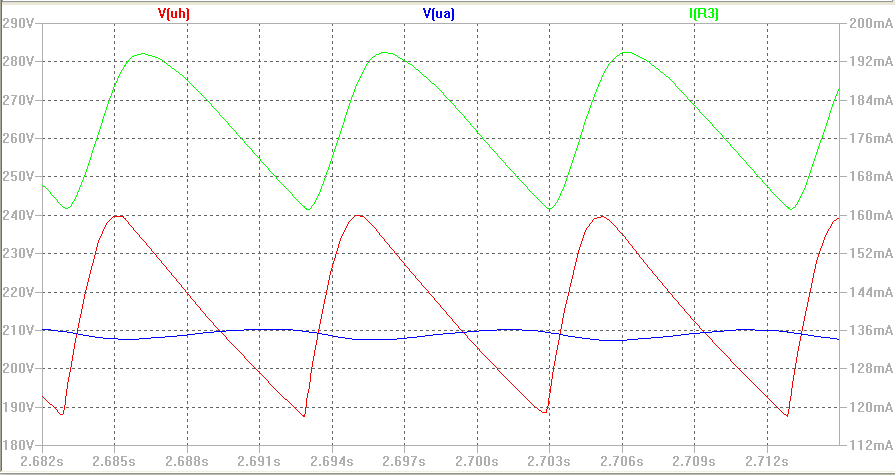 Die Abb. zeigt den den Verlauf der Spannungen Uh, Ua und den Heizstrom IR3 im Fall a). Dieser Fall kommt ohne Serienwiderstand der Alternative 3) am nächsten. Wie man sieht beträgt der Heizstrom im Mittel 180mA. Die Anodenspannung Ua liegt bei ca. 200V, der Brumm auf der Anodenspannung ist aber mit ca. 50Vss unakzeptabel groß.