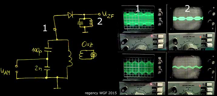 Die Spannungs-Überlagerung (1) und die Spannung am ZF Filter nach der Diode (2) wurden gleichzeitig gemessen. Der ZF Kreis wurde auf die Differenzfrequenz von Eingangssignal und Oszillator abgestimmt. Die NF Modulation ist stark übersteuert gewählt, so dass die trapezförmige Hüllkurve entsteht. Die unteren Bilder zeigen die "Trägerfrequenzen" durch Verkleinerung der Zeitbasis auf ein Hundertstel. Die Signale sind die gleichen wie jeweils darüber, nur der erfasste Zeitabschnitt ist entsprechend kleiner. Die ZF hat die gleiche Hüllkurve wie das AM modulierte Eingangssignal.