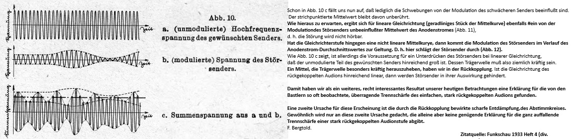 ---- Übrigens geht Bergtold auch auf einen Nebenaspekt ein, nämlich den von den Detektor-Bastlern bemerkten Umstand, dass der Detektor verzerrungsfreier empfängt als das Audion ohne Rückkopplung.