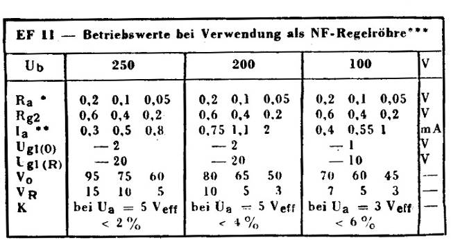 Bitte bei den Berechnungen bedenken das die EF11 in dieser Schaltung als NF Regelröhre verwendet wird in der sog. Vorwärtsregelung. Die Verstärkung der Röhre liefert max 5 V eff. Der Spannungsteiler der GK wirkt ja auf die Anode der EF11 im Prinzip auf das Gitter der EL11. Die braucht 4,2 Veff zur Vollausteuerung, die Vorstufe mit der EF11 liefert max 5 Veff., so kann die GK max. 20 - 25% betragen um die nötigen Spannungen an der Anode der EL11 zu erbringen. Die ganze Sache ist auch noch Frequenzabhängig.