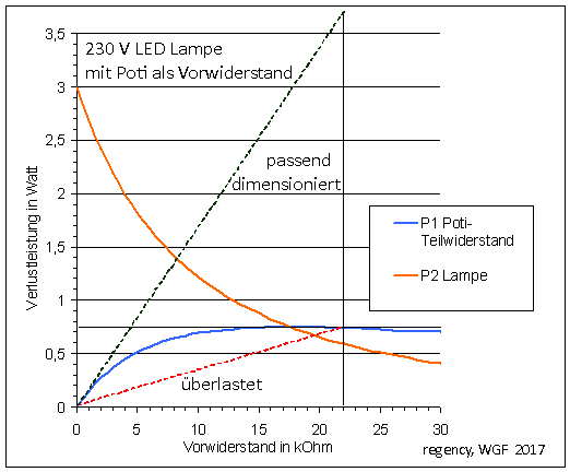 Warum also nicht einfach den ohmschen Widerstand eines Potentiometers als Vorwiderstand zur Lampe nutzen? Welche Leistung und welchen Widerstand müsste das Potentiometer dann haben?