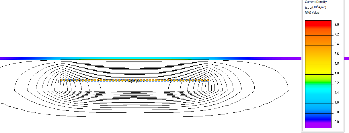 Ohne Schirmung sind die Feldlinien noch unbeeinflusst. Imm unteren Teil des Bildes befindet sich der Ferritstab als halber Querschnitt in der Rotationssymmetrie. Etwas entfernt davon sieht man ebenfalls im Querschnitt die 49 Windungen der Spule.