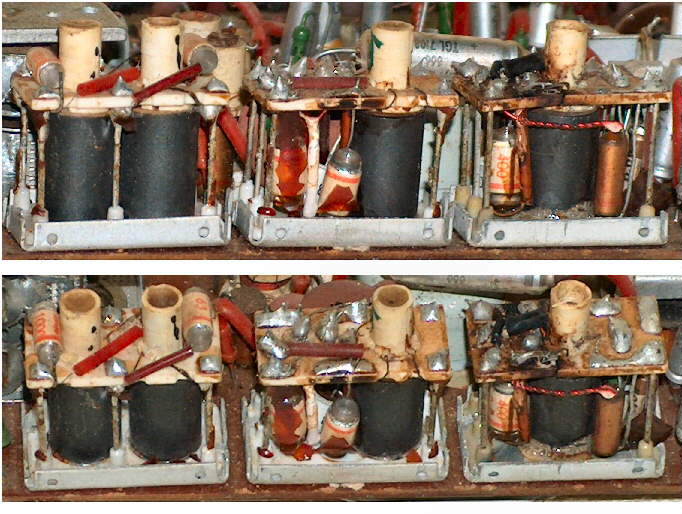 Der Wachsverguß (Chlornaphthalin?) war völlig ungeeignet, den Wickel über einen längeren Zeitraum abzudichten. Das ist mit der Zeit eingetrocknet, was zu Rissen führte, über die dann Luftfeuchtigkeit eindringen konnte. Die goldenen wie im Bild unten links sehen wesentlich zuverlässiger aus, sind es aber leider ebensowenig. Denen sieht man nur nicht an, daß sie defekt sein könnten. In meinem Rossini haben sie alle 4 EL95 gekillt. Seitdem stehen auch die bei mir auf der Abschußliste.
