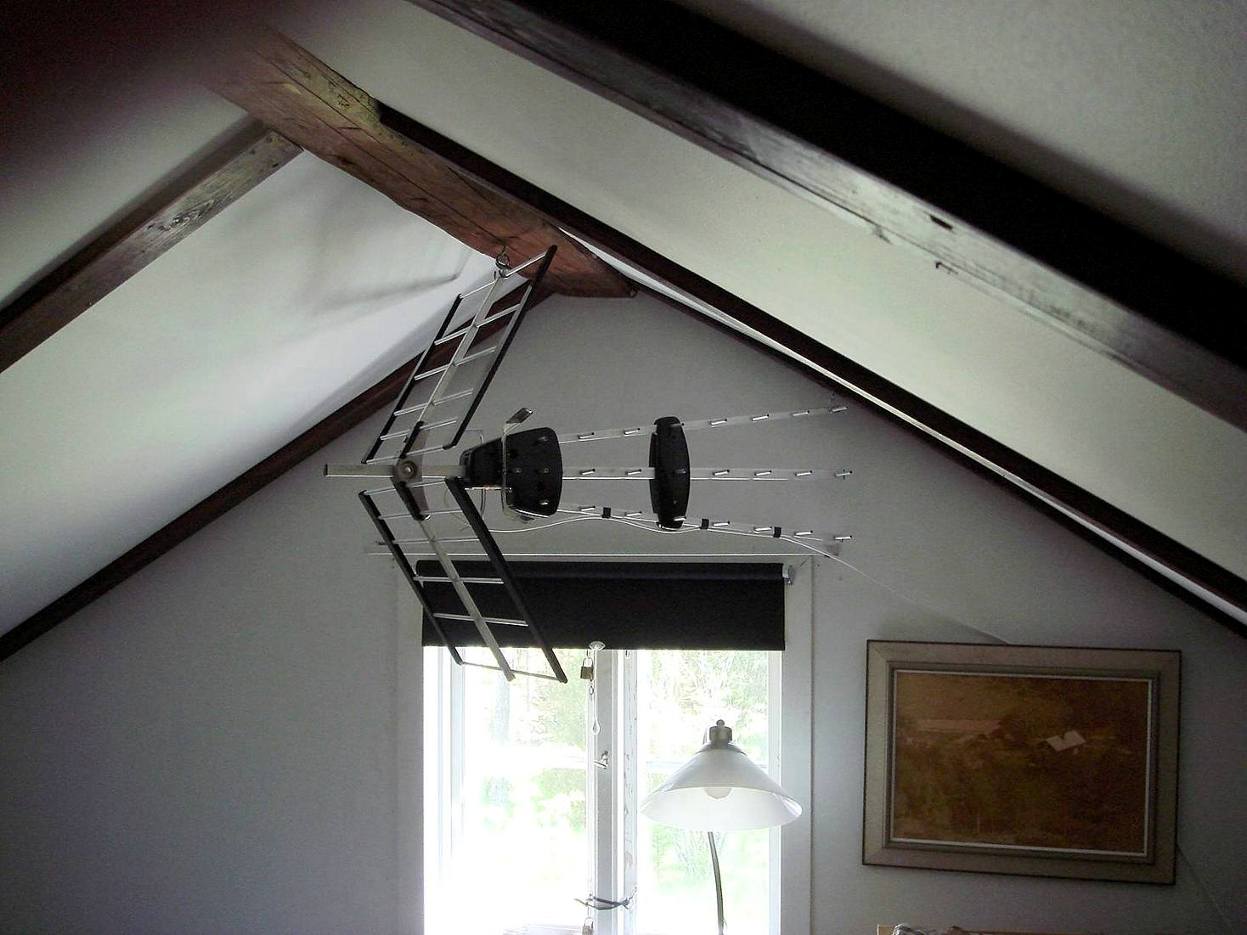 Die Fernseh-Digitalantenne habe ich im Schlafzimmer (also innen) am First-Dachbalken aufgehangen. (Foto).