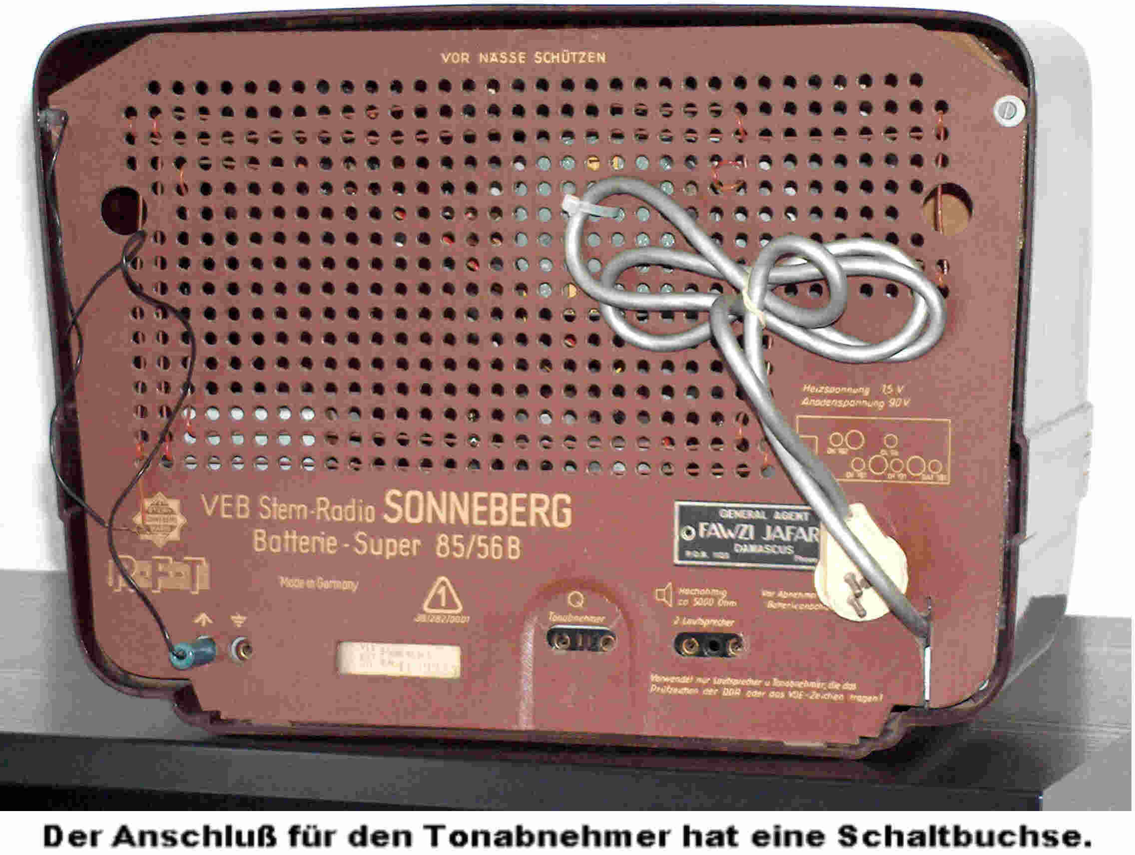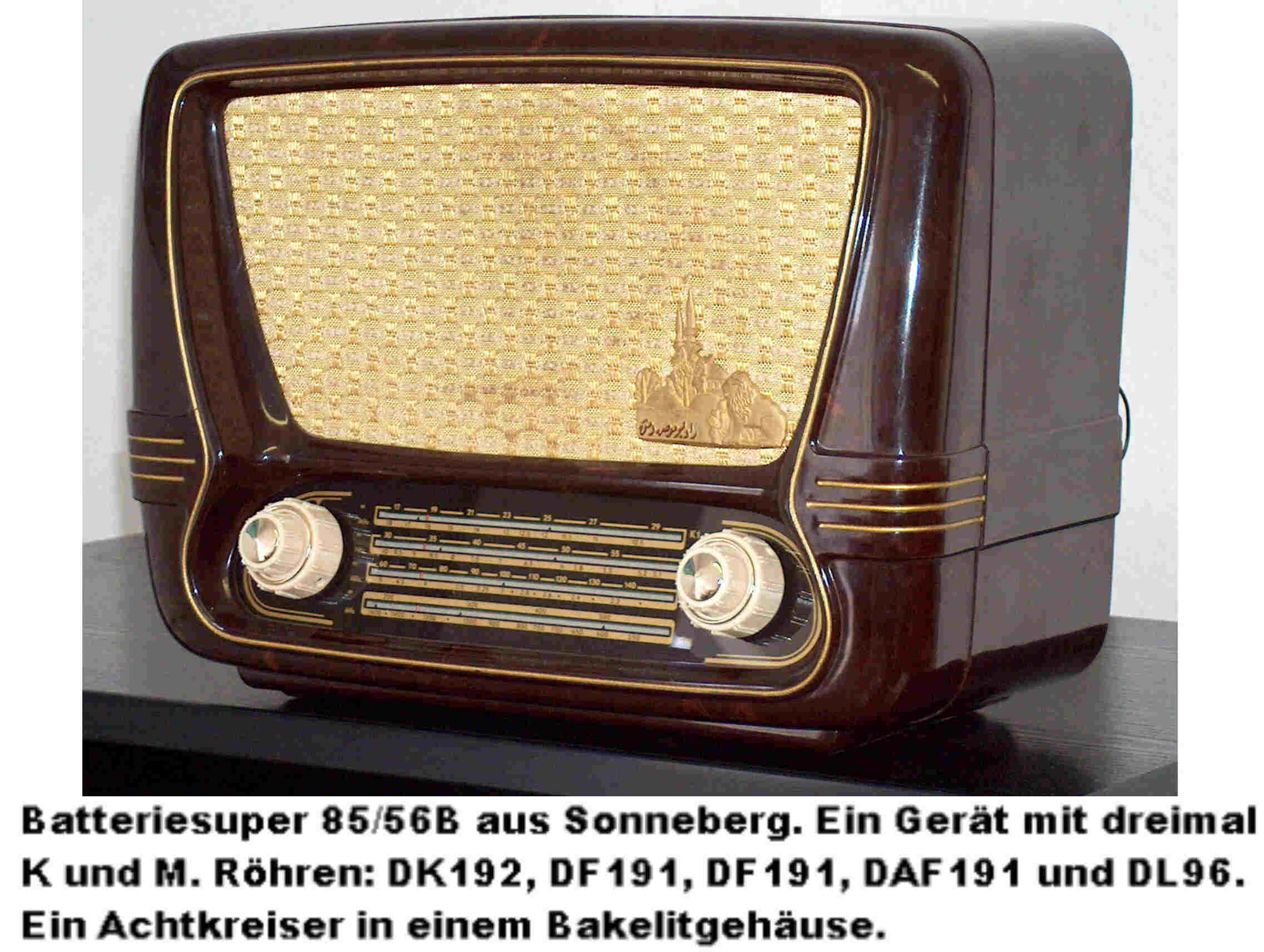 Von den Sonneberger Wechselstromsupern waren etliche "bissig", das heißt ohne Netztrennung aufgebaut. Das Vorhandensein von E- Röhren garantiert also keine Netztrennung. Hier sollte man unbedingt schauen, wo die Anodenspannung herkommt. Erster Anhalt hierbei ist die Größe des Netztrafos. Der Batteriesuper B85 ist ein recht interessantes Gerät im Preßstoffgehäuse eines Heimempfängers. Als Achtkreiser hat er eine beachtliche Empfangsleistung und wurde auch exportiert.