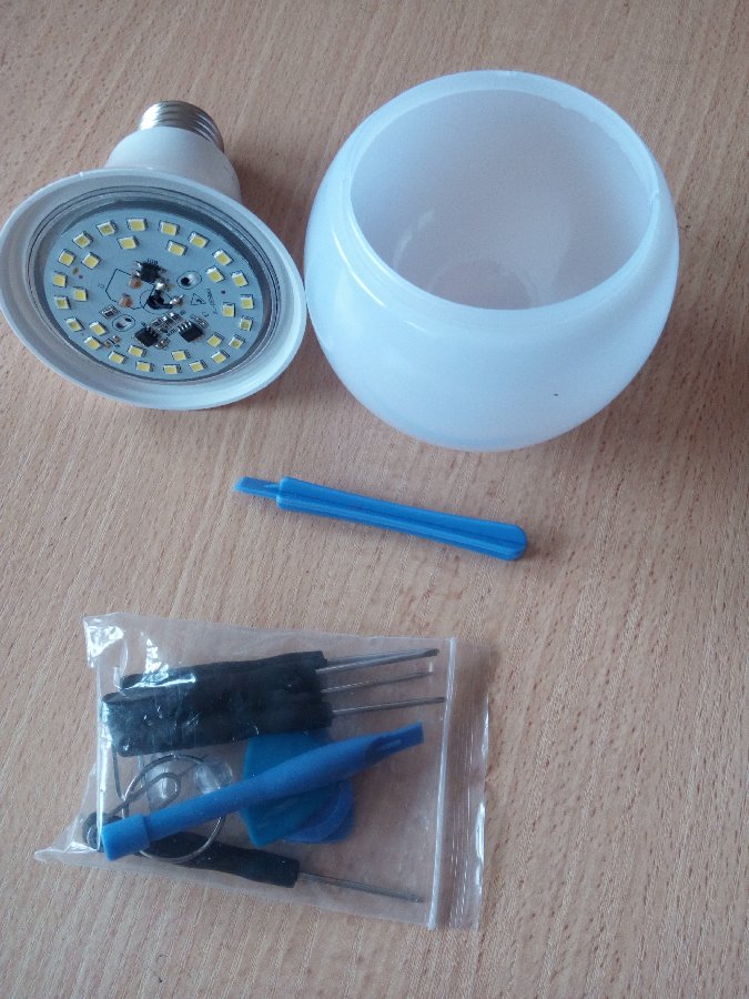 Die "Milchglaskappe" ist nur aufgesetzt und rastet am Übergang zum Kühlkörper nur ein. Ein für wenige cent in China erhältliches Handyreparatur Werkzeugset hat bei der Öffnung geholfen...