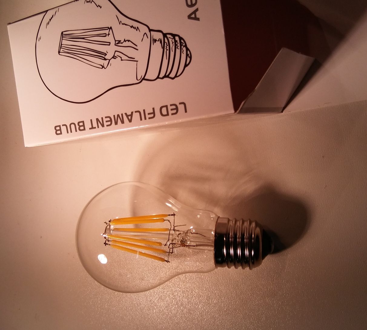 normalerweise lasse ich von LED Lampen die Finger. Nachdem aber in der Amateurfunkzeitschrift 09/2017 behauptet wurde, dass die LED-Filament-Lampen keine Störungen produzieren, habe ich mir ein paar gekauft und kann diese Feststellung bestätigen. Diese Lampen brauchen kein Vorschaltgerät bzw. Wandler. Obwohl ich kein Flackern sehen kann, ergibt sich bei schnellen Bewegungen ein Stroposkopeffekt und Handy-Aufnahmen gelingen auch nicht. Ob mich das Licht auf lange Sicht "kirre" macht, bleibt auch abzuwarten. Die Lampen gibt es in 2W-Abstufungen zwischen 2 und 8 Watt. Die 6 Watt Lampe hat etwa die Leuchtkraft einer 60W Glühlampe. Die Farbtemperatur um 3000 Grad Kelvin ist ok und "warm". Die eine Hälfte der 1W LEDs ist parallel geschaltet und mit der anderen Hälfte in Serie.