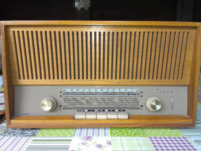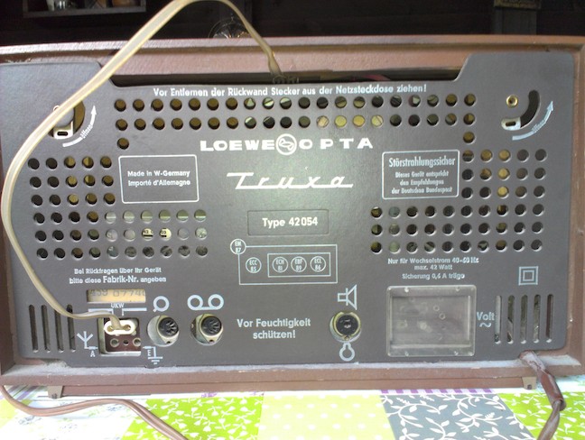 ein alter Bekannter von mir (84J Alt) hatte mich darum gebeten, herauszufinden was sein altes Radio jetzt wert wäre und ob es sich lohnt zu verkaufen. Es handelt sich dabei, um ein "Loewe Opta Truxa" model 42054. Zustand ist sehr gut - keine Kratzer, Holz in sehr gutem Zustand. Es hatte sofort auf "U" Radiosender empfangen ..konnte aber nichts auf "L" oder "M" finden. Auf "K" habe ich einige Asiatische Radiosender gefunden, vermute ich wenigstens. Die Antenna (kleine Schlaufe hinten) und Stromkabel sind Originalteile.