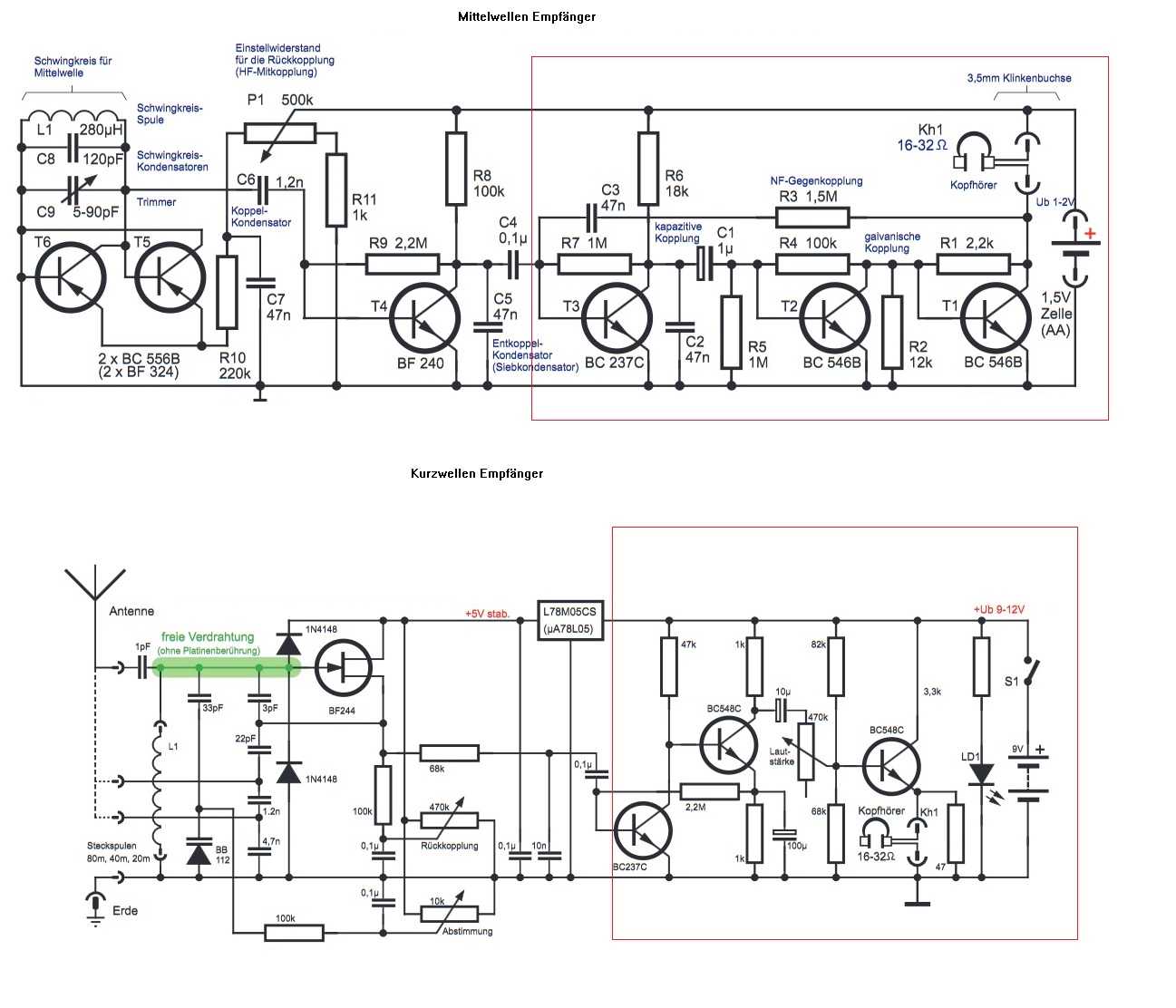 Hallo Technikfreund Du willst einen Einkreiser für MW und KW bauen . Ich sehe da noch zusätzliche Probleme beider Schaltungen , das sind die unterschiedlichen Betriebsspannungen , unterschiedliche Senderabstimmungen. Im Netz gibt es zahlreiche Seiten mit Plänen von Einkreisern mit Halbleitern. Somit würde ich mich erst mal festlegen , die höhe der Betriebsspannung ( 9 Volt ) , den zu empfangenen Frequenzbereich und deren Abstimmung ( mechanisch oder kapazitiv mittels Kapazitätsdiode , wobei ich den mechanischen Drehko vorziehen würde ) Die HF Stufen würde ich, wie du, pro Frequenzbereich einzeln aufbauen . Dabei kann man bei einen Doppeldrehko, ein Paket für MW und das 2. Paket für KW nehmen. Auch brauchst du einen Umschalter für die jeweilige HF Stufe . das sind Betriebsspannung und NF . Schaue mal auf dieser Seite : http://radiosparks.com/schematics.asp?UI...2D+regenerative , speziell Figure 1051 : RX1 , da hätte ich zumindestens einen Anhaltspunkt. Ich wünsche viel Spass beim bauen und frohe Ostern.