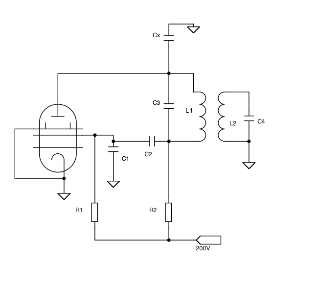 Das ist eine typische ZF-Stufe. L1/C3 und L2/C4 bilden das ZF-Filter, R1 ist der Schirmgitter-Vorwiderstand und C1 der Schirmgitter-Abblockkondensator. R2 ist der Anodenspannungs-Siebwiderstand und C2 der zugehörige Abblockkondensator, der wie schon geschrieben nicht direkt auf Masse führt, sondern via C1. Der Kondensator Cx existiert normalerweise nicht als Bauteil und ist hier stellvertretend für alle Kapazitäten im Anodenkreis nach Masse. Bei Hexoden wird das ebenfalls angewendet.