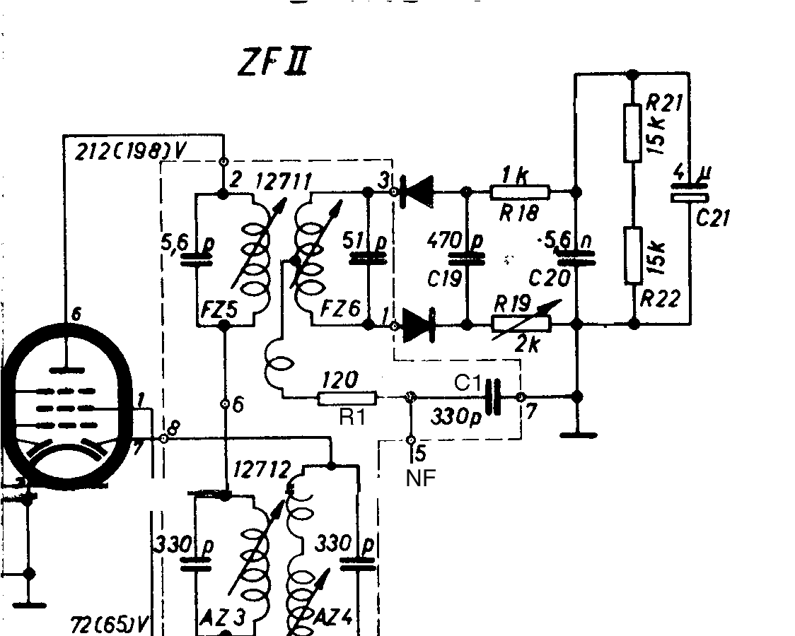 FZ5 ist der primärseitige ZF-Kreis, unten (angeschnitten) folgt noch der AM-Teil, der hier nicht interessiert. FZ6 ist der Referenzkreis, der auch hier lose mit FZ5 gekoppelt ist. Somit sind die Spannungen über den beiden Schwingkreisspulen in Bandmitte ebenfalls um 90° gegeneinander phasenverschoben. Die Koppelspule (zwischen R1 und FZ6) ist fest mit der Spule von FZ5 gekoppelt, somit ist die induzierte Spannung in Phase mit FZ5. Man könnte auch mit einem Kondensator koppeln, aber dann wird die NF-Auskopplung komplizierter. Mit den beiden Dioden wird die ZF gleichgerichtet. Weil diese für Gleichstrom in Serie liegen, gibt es trotz den beiden Dioden nur eine Halbweggleichrichtung. Die Widerstände R18 und R19 sorgen für Symmetrie, da die Innenwiderstände der frühen Germaniumdioden relativ grosse Toleranzen hatten. Elko C21 lädt sich auf den Scheitelwert der ZF auf, C20 sorgt für einen HF-Kurzschluss. Die Widerstände R21 und R22 sorgen dafür, dass sich der Elko wieder entladen kann. Die Spannung am Elko wird für die Abstimmanzeige (magisches Band) und teilweise auch zur Verstärkungsregelung verwendet. R1 sorgt für eine definierte Dämpfung und kann für das Verständnis als Kurzschluss angesehen werden, C1 ist für HF ein Kurzschluss. Die NF liegt an C1 und wird noch zwecks Korrektur des Frequenzgangs tiefpassgefiltert (nicht mehr auf der Zeichnung).