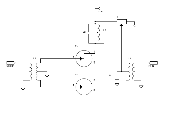 Eine bessere Lösung sind halbsymmetrische Mischer, die aber zwei Transistoren (oder Röhren) brauchen. Hier kann wahlweise das Eingangs- oder Oszillatorsignal am ZF-Ausgang unterdrückt werden. Hier ein Beispiel: Das HF-Signal gelangt über den Symmetrie-Trafo L2 gegenphasig an die Gates der beiden Transistoren. Da die Drains parallelgeschaltet sind, heben sich die gegenphasigen Drainströme vom Eingangssignal auf, somit gibt es keinen ZF-Durchschlag. Das Oszillatorsignal wird über L1 gegenphasig auf die beiden Sources eingespeist, die Amplitude ist dabei so gross, dass die FETs nur während der negativen Halbwelle am jeweiligen Source-Anschluss leiten und damit das HF-Eingangssignal verstärken. Mit P1 wird der optimale Arbeitspunkt eingestellt. Das Prinzip ist folgendes: Während der positiven Halbwelle vom Oszillator ist T3 gesperrt und T2 verstärkt das durch L2 invertierte Eingangssignal, somit ist (v ist Mischverstärkung): I_ZF = v * U_OSZI * (-U_HF). Während der negativen Halbwelle von Oszillator ist es genau umgekehrt: I_ZF = v * U_OSZI * U_HF Das Eingangssignal wird also entsprechend dem Vorzeichen der Oszillatorspannung invertiert oder nicht invertiert verstärkt, die Transistoren arbeiten hier als Schalter und Verstärker.