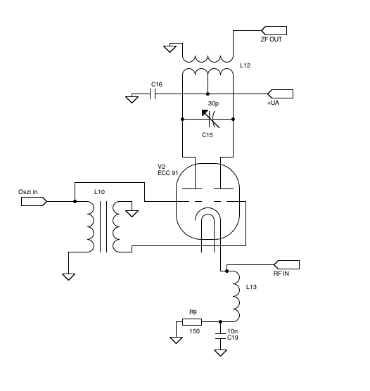 Der Nachteil ist hier die Verstärkung des Oszillatorsignals, was aber bei geeigneter Wahl der ZF und ausreichender Filterung vor der 1. ZF-Stufe kein Problem ist. Der Vorteil liegt darin, dass das Oszillatorsignal nicht zum Eingang durchschlägt, da die beiden Gitter gegenüber der Kathode gegenphasig gespeist sind und sich somit die Spannungen an der Kathode aufheben. An Stelle der ECC91 kann man natürlich auch 'normale' HF-Trioden oder auch Pentoden verwenden, die Kathoden werden dann miteinander verbunden.