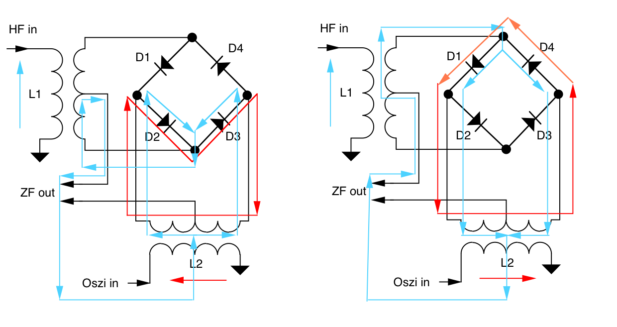 Nun zur Funktion. Die Dioden arbeiten hier als HF-Schalter, dabei ist zu beachten, dass die Schaltung mit idealen Dioden nicht funktionieren würde, die Vorwärts-Fluss-Spannung ist für die Funktion obligatorisch und ein wichtiges Kriterium: Eine hohe Fluss-Spannung ergibt eine hohe Dynamik, erfordert aber eine hohe Oszillatorleistung, während eine niedrige Fluss-Spannung (Schottky-Dioden) weniger Oszillatorleistung braucht, dafür weniger Dynamik bietet. Die Oszillatorspannung muss deutlich grösser als zwei Fluss-Spannungen sein, damit die Dioden leiten können, während das HF-Signal deutlich kleiner als eine Fluss-Spannung sein muss, sonst gibt es üble Verzerrungen.