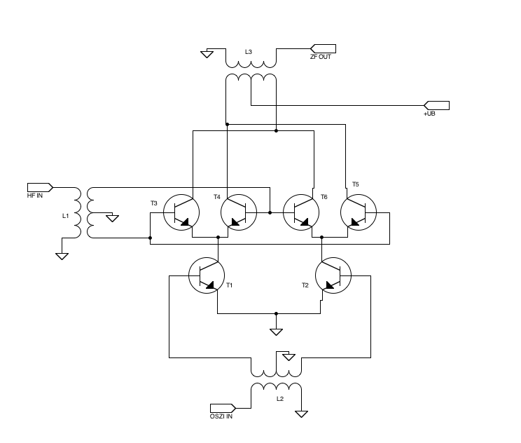 Aus Oszillatorsicht: HF positiv: T4 und T6 leiten, T3 und T5 gesperrt -> Oszillatorspannung wird im Gegentakt mit T1/T4 und T2/T6 verstärkt und von T1/T2 sowie L3 invertiert, also effektiv ZF-Signal in Phase mit Oszillatorspannung HF negativ: T3 und T5 leiten, T4 und T6 gesperrt -> Oszillatorspannung wird im Gegentakt mit T1/T3 und T2/T5 verstärkt, jetzt ist L3 gegenüber vorher umgepolt -> ZF-Ausgang in Gegenphase zum Oszillatorsignal
