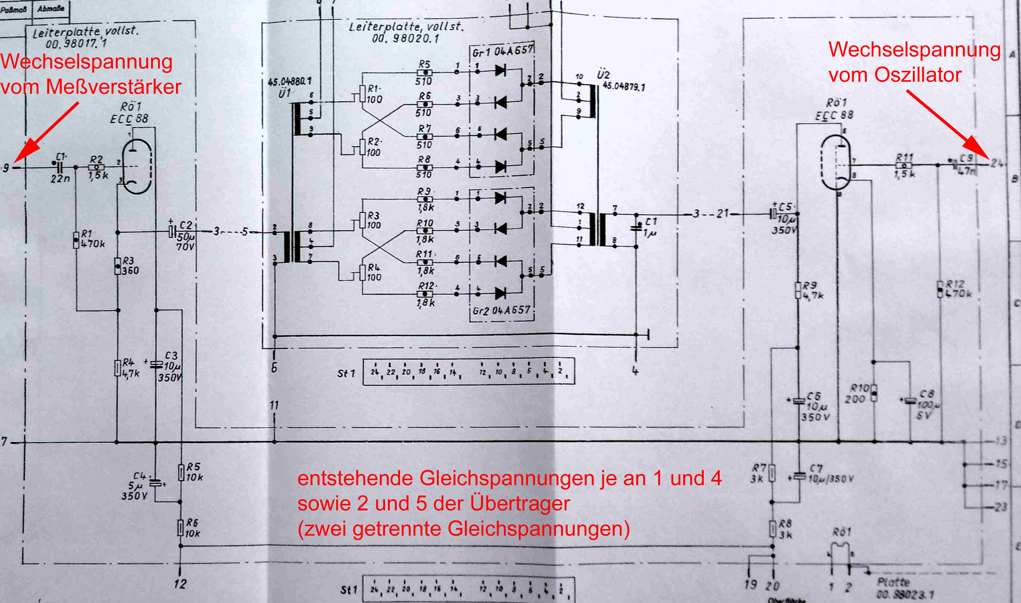 die Oszillatoramplitude hat praktisch keinen Einfluss auf die Ausgangsspannung, solange sie genug hoch und symmetrisch ist. Eine Asymmetrie bringt einen amplitudenabhängigen Offset. Je nach Diodentyp kann es auch sein, dass die Dioden nicht mehr über alle Zweifel erhaben sind. Selen-Dioden sind Verbrauchsmaterial, die dürften weggedriftet sein, während Ge- oder Si-Dioden stabiler sind, aber auch die könnne altern. Mit einem Ohmmeter können sie auf Gleichheit in Durchlassrichtung geprüft werden, dabei müssen sie einseitig abgehängt werden, was auf der Seite der Widerstände gut möglich sein sollte. Vor dem Messen unbedingt eine längere Abkühlpause einlegen, da die Fluss-Spannung stark temperaturabhängig ist. Wenn die Dioden in Ordnung sind, sollte man die Kurvenform des Oszillatorsignals anschauen, das muss symmetrisch sein, also beide Halbwellen gleiche Amplitude und Form. Im Fall einer emissionsschwachen Röhre kann es durchaus Verzerrungen geben, wenn sie den nötigen Spitzenstrom nicht mehr bringt.