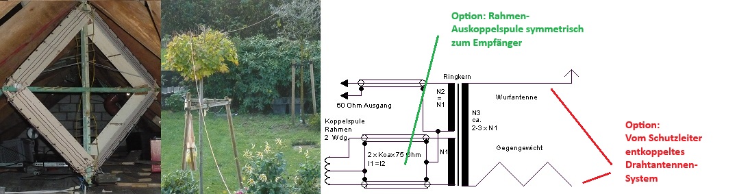 Es wurden Versuche durchgeführt, und zwar MW-Empfang mit: A) Großem Rahmen im Kriechboden, darunter eine Schirmfläche. B) Wurfantenne im Garten, Schutzleiter, Heizung und Empfänger-Erde (EK07D) als Gegengewicht. C) Wurfantenne im Garten, Gegengewichtsdraht unter der Antenne, beides über Trenn-Übertrager (Ringkern) auf den Empfänger.
