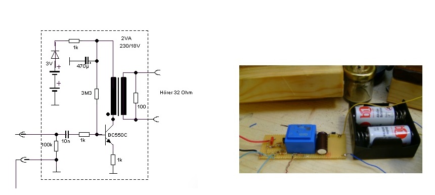 Die Lösung besteht wieder in der galvanischen Trennung, für sehr kleine Spannungen, wie sie beim Detektor auftreten, kann man mit einfachsten Mitteln einen batteriebetribenen Trennverstärker bauen. Der ist auch gut als kleiner Kopfhörerverstärker mit geringem Stromverbrauch zu verwenden.