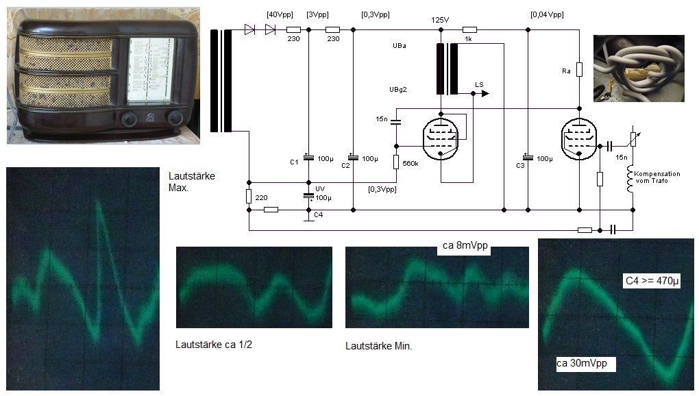 Bei der Überarbeitung meines "Radiolas" stellte sich heraus, -die Reihenfolge der Röhren in der Heizkette nicht willkürlich gewählt wurde -Eine Vergrößerung eines Siebelkos eine höhere Brummspannung zur Folge hatte -Das ein Teil der Wechselspannung auf das Gitter der Endröhre zurückgeführt wurde.