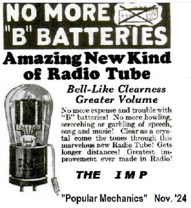 Nun will ich nicht so schnell ein Urteil abgeben, wovon ich nur wenig Einsicht habe, was sich damals in den USA so abspielte. Aus diesem Grund habe ich in einem bekannten USA Radio-Forum diese Frage aufgeworfen: Kam untenstehende Röhre wirklich in den Handel? Oder war das nur eine "vielversprechende" Werbung? Bisher konnte keiner die Existens der "IMP" bestätigen.....