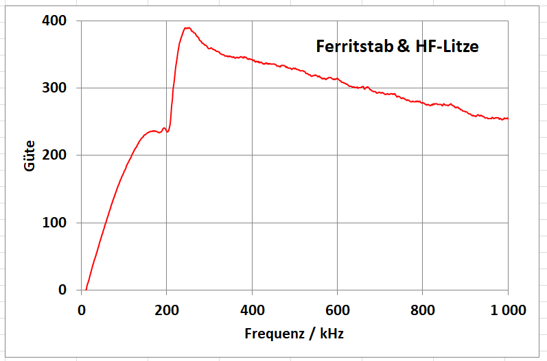 Hajo:Wenn man sich die Spitze oberhalb- und den kurzen Einbruch unterhalb 200kHz wegdenkt (dem Meßverfahren in die Schuhe schiebt ) ist es durchaus plausibel und ergibt ein schönes rundes Gütemaximum von reichlich 300 zwischen 200- und 400kHz.