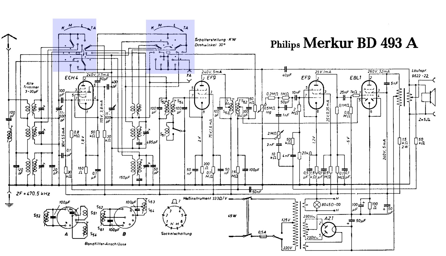ein Geständnis: Beim Lesen und Erfassen von Schaltbildern bleibe ich immer wieder an der Erkennbarkeit von Wellenschaltern mit seinen oft diversen Schalterstellungen "kleben". Zum Kuckuck, wie haben die das gemeint? Gerade wieder ist mir das beim Betrachten des Lange-Schaltbildes zum Philips Merkur BD493A so gegangen.