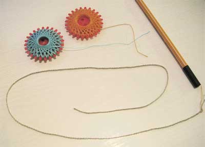 Die zweifarbige Kordel wird wie folgt hergestellt. Man benötigt zwei verschiedenfarbige Fäden in der doppelten Länge zzgl. etwa 20 Prozent der gewünschten Skalenseillänge. Die Enden werden verknotet. Eine Seite wird an einem Haken z.B. an der Wand eingehängt, das andere mit einem querstehenden Filzstift o.ä. straff gezogen. Daumen und Zeigefinger halten diese Ende straff und der Stift wird mit der anderen Hand gedreht, so dass beide Fäden solang verdrillt werden bis am Haken nur noch eine kleine Schlaufe ist.