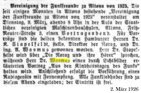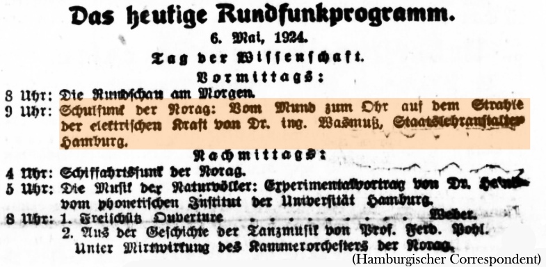 Die Norag hat am 2. Mai 1924 den erstmaligen Sendebetrieb aufgenommen, vom 6. Mai ist das Programm. Der Inhalt des Programms selbst ist auch witzig: "Musik der Naturvölker" als Experimentalvortrag und "Nachmittags 8 Uhr ...". Das Schulprogramm war dann wohl Gemeinschaftsempfang. Der genannte Dr. Wasmuß könnte Dr. Wasmus sein, der in der NDR Chronik im zweiten Bild links in der Akustikkammer gezeigt wird.