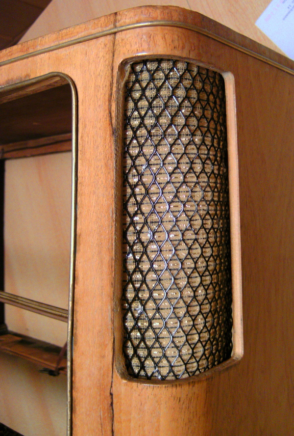 Einen kleinen Eindruck von Details des Gehäuses, die ich geändert hab. Nun die Seitenschallwand des Tonmeisters. Es fehlt die äußere Umrandung der Schallwandöffnung, dort will ich einen Keder (Piping) anbringen. Ich weiß nur noch nicht in dem Braun der Drehknöpfe oder in Goldfarbe.