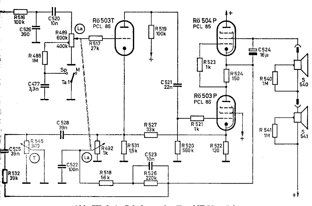 Beim Stöbern in alten Schaltungen fand ich diese eisenlose NF Endstufe. Der Knackpunkt dabei sind die Speziallautsprecher mit 600 - 800 Impedanz. Eine einfache Idee wäre diese durch 100 V Übertrager zu ersetzen. So kann man sich den teuren Röhren AÜ ersparen. Eine Abänderung der Schaltung an eigene Ideen dürfte nicht ein unüberwindbares Hindernis sein.