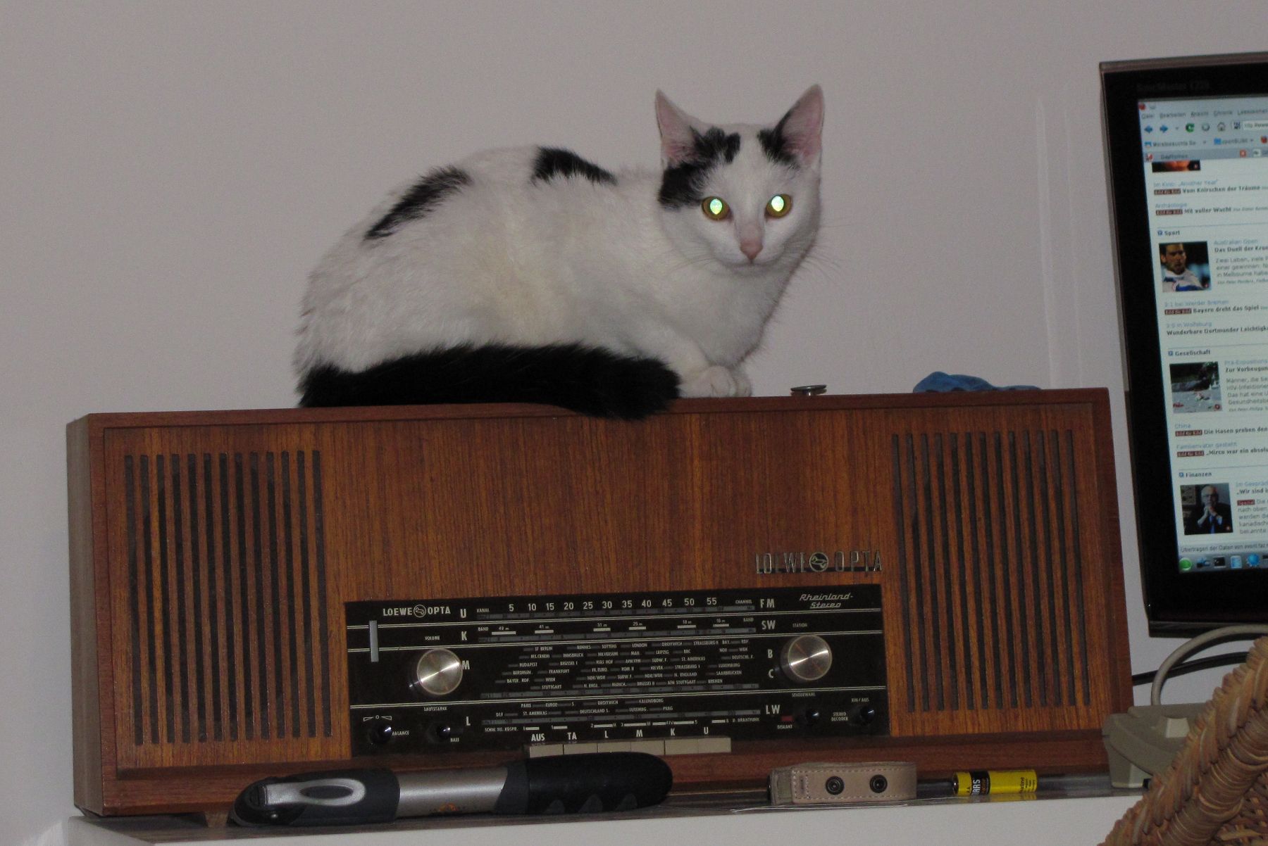 anbei: andere Katze (näümlich unsere), anderes Radio, aber gleiche Vorliebe und auch zwei magische Augen. Warum ist wohl klar: Die alten Radios sind doch oben sooo muggelich warm!