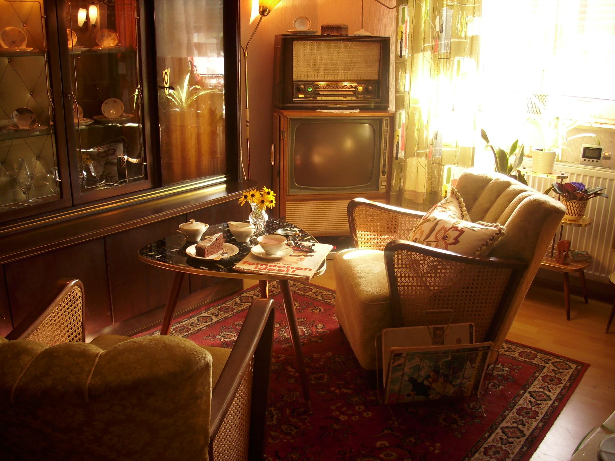 Fast genauso sah es bei uns in der guten alten Stube aus. Nur einen Fernseher konnten wir uns erst in den 60 Jahren leisten. Fury+Lassie durften wir in mit dem Gastwirtensohn im Nebenzimmer der Wirtschaft bei Bluna und Salzstangen geniessen. Aber danach gab es bei Muttern für uns Kinder Malzkaffee und Kuchen, der Vater qualmte seine Sonntagszigarre und lauschte den Sportnachrichten. Am meisten interessierten ihn die Fußballspiele der Berliner Vereine. Er hatte einige Jahre in Berlin gelebt und dort gearbeitet. Ich für meine Person saß mehr hinter dem Radio als davor. Der Grund dafür waren die herrlich klimmenden Röhren. Mit 3-4 Jahren glaubte ich fest daran, dass in den leuchtenden Röhren die Musiker sitzen und musizieren. Fasziniert war ich auch vom Leuchten des magischen Auges. Aber das sah man ja von vorne. Gedreht und gekurbelt wurde, alle möglichen Wellenlängen ausprobiert und andächtig in den Äther gelauscht.