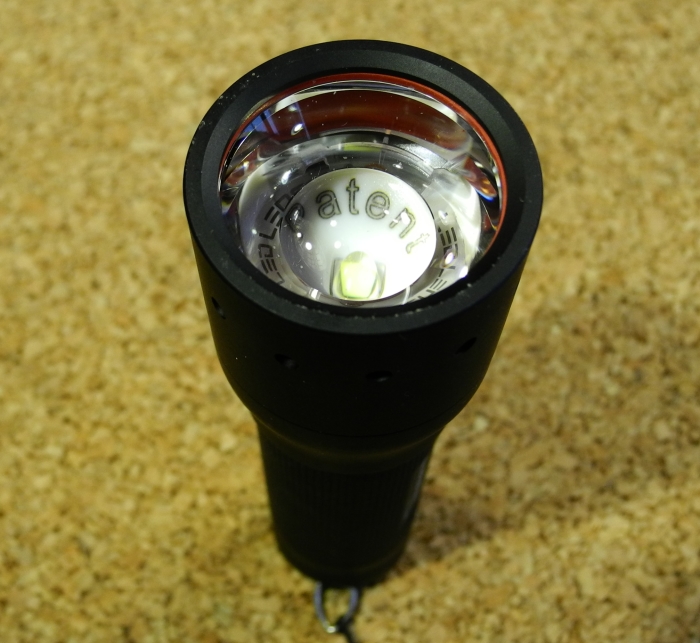 Die Lampe bietet zwei Helligkeitsstufen und Boost. Das Beste ist eine hervorragende Zoom-Einstellung, kontinuierlich zwischen breit und schmal einstellbar. Dabei ist der Leuchtkreis immer ohne Strukturen, Ringen, usw. Insbesondere die Gleichmäßigkeit in Stellung breit ist bemerkenswert. Der gute Fokus entsteht durch eine trickreiche in sich übergehende Konvex/Konkav-Linse.