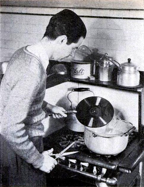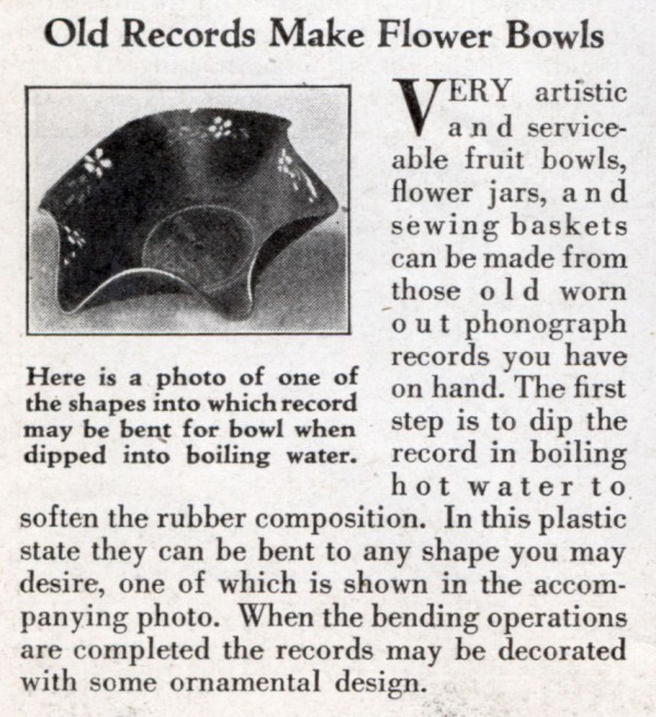 Schellackplatten werden schon so bei 60 - 70 Grad weich. Deswegen das Wasserbad. Wenn sie erst mal weich sind, kann man sie sogar mit der Schere zuschneiden. Vinyl wird erst so bei c. 120 Grad voll "formbar". Die Herstellung solcher Vinyl-Schalen ist denkbar einfach: Eine passende Metallschüssel bzw. Form mit der Öffnung nach unten auf ein Backblech legen. Oben drauf die Schallplatte. Dann für c. 5 Minuten ab damit in den vorgeheizten Backofen bei c. 120 Grad. Der "Faltenwurf" ergibt sich von selber.