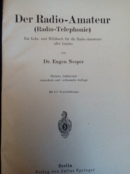 nicht zu vergessen das Standardwerk für alle "Radioamateure", das Buch von Eugen Nesper "Der Radio-Amateur". Sollte bei keinem an der Radiogeschichte und -technik Interessierten in der "Hausbibliothek" fehlen! Heute leider nicht mehr für 5 oder 10 DM zu bekommen, diese Zeiten sind wie der analoge Rundfunk vorbei... Auf 858 Seiten geballte Technik vom Feinsten, Stand 1920er Jahre. Die Auflagen davor waren "etwas" dünner...