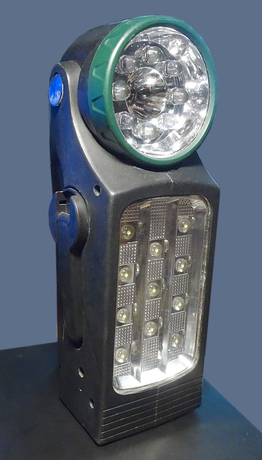 Dynamo / Akku - LED Leuchte mit Punktstrahler in zwei Stufen und rotem Blinklicht und einem Flächenleuchtenbereich.