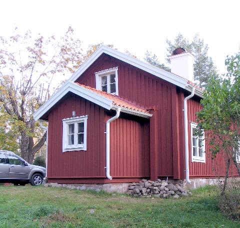 Mein Ferienhaus ist ein sehr altes Blockhaus aus Holz, wie üblich mit einer Bretterverschalung außen verkleidet (also eine Stuga).