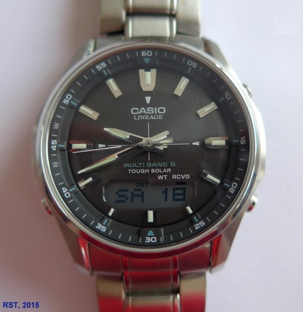 Das gilt auch für meine weitere etwas jüngere DCF-kontrollierte Armbanduhr von Casio. Das ist sogar eine ECO-Drive-Uhr mit Solar-Akku.