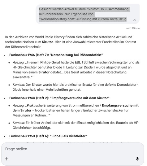 Es wurde auch ein Beitrag in diesem Forum ausgegeben, und hier stimmte aber die Angabe "Funkschau 1943 Heft 8-9", Der Artikel lautet: "Anregungen zum Detektorempfang". Bei einem Tippfehler etc. hätte die KI-Suche vermutlich ein falsches Ergebnis geliefert.
