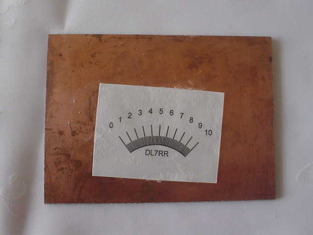 Hierbei zeigte sich,daß ein mit einer Instrumentenskala bedrucktes Papier sich plan laminieren läßt und passend zugeschnitten auf eine glatte Fläche,in meinem Fall ein kupferkaschiertes Epoxydharzplättchen kraftschlüssig mit Sekundenkleber plan aufkleben läßt.