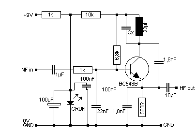 Admin: Steter Tropfen höhlt beim Admin nicht den Stein, deshalb auch hier der Hinweis: Sender (die auf Antennen wirken) unterliegen Rechtsvorschriften. Das ist bei einem eventuellen Nachbau zu beachten. Ich deute das Schaltbild so, dass eine Induktivität am HF-Ausgang angeschlossen wird. Sonst könnte das Schaltbild hier keinen Bestand haben, zumal keine Leistungsangaben gemacht wurden.
