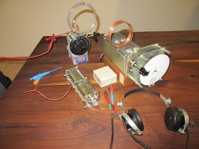 Einer meiner KW- Versuche, die Trennschärfe hat mich lange beschäftigt. Im Kästchen Diode, Übertrager usw... zur Anpassung. Rot = Antenne, keine Erde. Rein induktiv gekoppelte Kreise. Erde über kapazitive Effekte... z.B. Hörer.