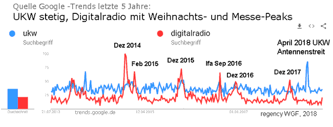 Hier der Verlauf der relativen Häufigkeit der Google Suche in Deutschland nach "UKW" und "Digitalradio" im Vergleich der letzten Jahre. Den Peak Anfang Februar 2015 kann ich nicht zuordnen. Oder doch? Ab Februar 2015 hat BR Heimat rund um die Uhr Volksmusik auf DAB+ ausgestrahlt....aber so eine Zacke?