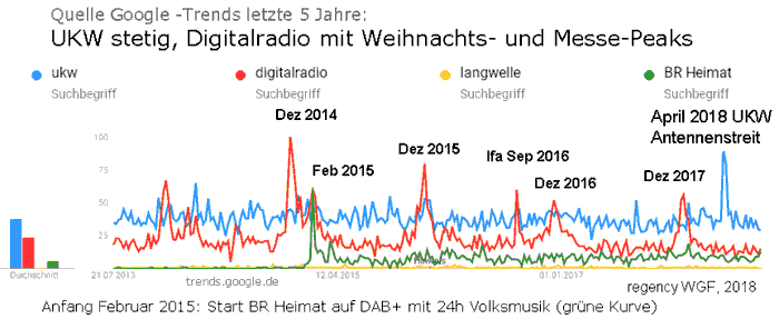 Ich habe mal die Suchbegriffe "Langwelle" und "BR Heimat" zusätzlich zu "UKW" und "Digitalradio" eingegeben. Siehe da: Für den Tod der Langwelle hat sich kaum einer interessiert. Aber der Start des digitalen bayrischen Heimatprogramms zeigt eine eindeutige zeitliche Übereinstimmung mit dem Digitalradio-Peak Anfang Februar 2015.