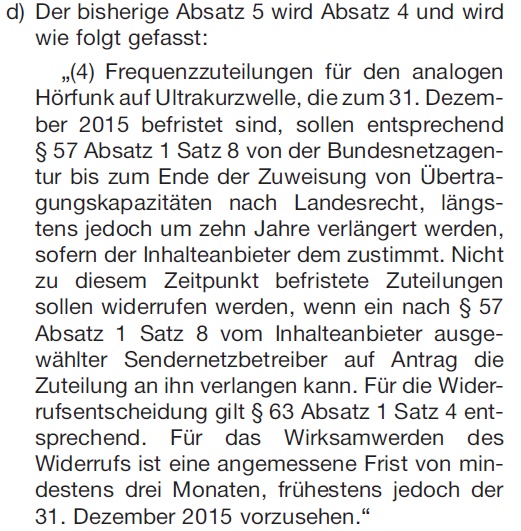 Die Bundesnetzagentur soll Frequenzzuteilungen für analoge Rundfunkübertragungen auf der Grundlage der rundfunkrechtlichen Festlegungen der zuständigen Landesbehörde nach Maßgabe des Frequenznutzungsplanes für den Fernsehrundfunk bis spätestens 2010 und für den UKW-Hörfunk bis spätestens 2015 widerrufen. Die Hörfunkübertragungen über Lang-, Mittel- und Kurzwelle bleiben unberührt. Die Frequenzzuteilung erlischt nach einer im Widerruf festzusetzenden angemessenen Frist von mindestens einem Jahr.
