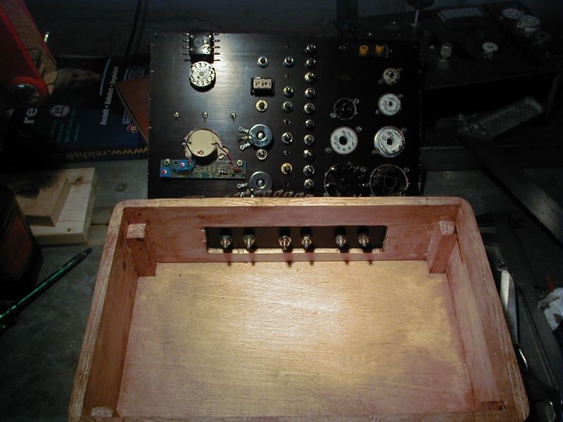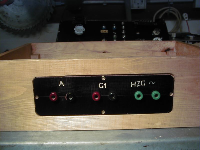 Stufe 3 Zum Aufbau habe ich eine Holzkiste aus dem Baumarkt genommen. Die Frontplatte stammt ebenfalls von dort (5mm Schalungstafel). Das Messgerät hat 100µA Vollausschlag und wurde mit Scanner und Laserdrucker für den Zweck hergerichtet.