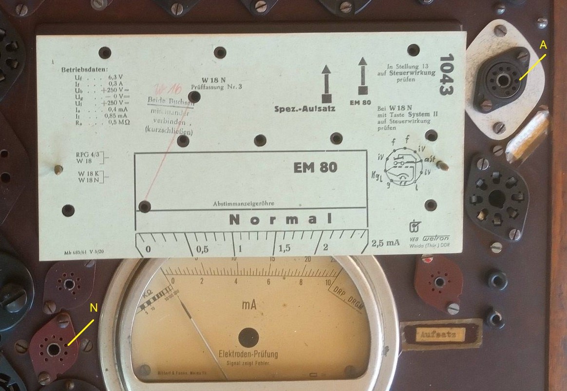 Ich mache mir Sorgen, weil Stift 3 bei diesen Magischen Augen intern mit dem Leuchtschirm an Stift 9 verbunden ist. Normalerweise bekommt der Leuchtschirm die volle Anodenspannung, so um die 250V. Wie ich schon ausführte, die neue Novalfassung hat jedoch Feder 3 fest an Katode gelegt. Das müsste bei der Emissionsprüfung in Stellung 12 & 13 einen Kurzschluss verursachen, was das Instrument himmeln kann.