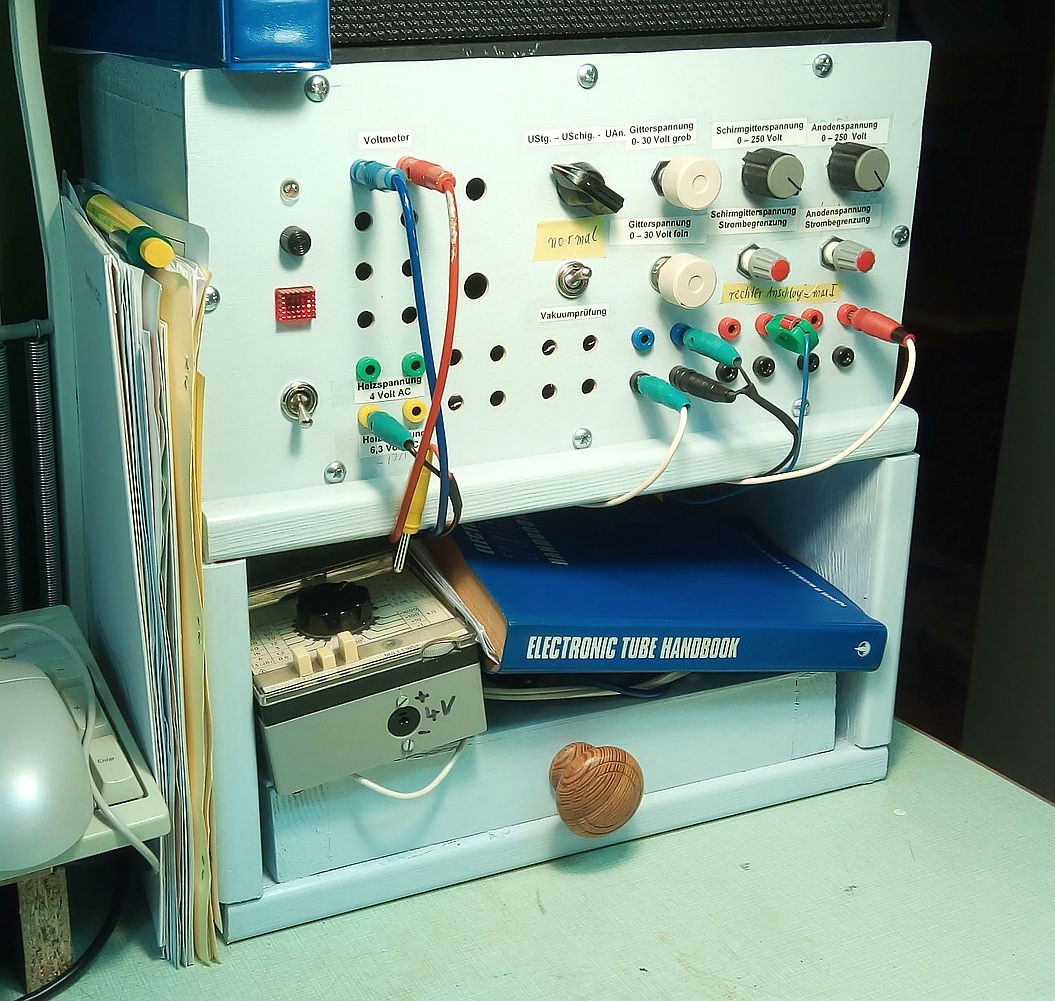 Die Pappstreifen haben sich bewährt und beschleunigen das Stöpseln der Kabel. Neu ist auch der Türknopf zum bequemeren Herausziehen des Kastens mit den den Röhrenfassungen. Ein Novum ist die bereitliegende leere Papphülse einer Klopapierrolle. Sie dient zum Herausziehen der heißen Röhren. Die Papphülse wurde aus Gründen der Ästhetik mit farbigen Abklebebändern aufgehübscht und ist rechts unten im Bild zu sehen.