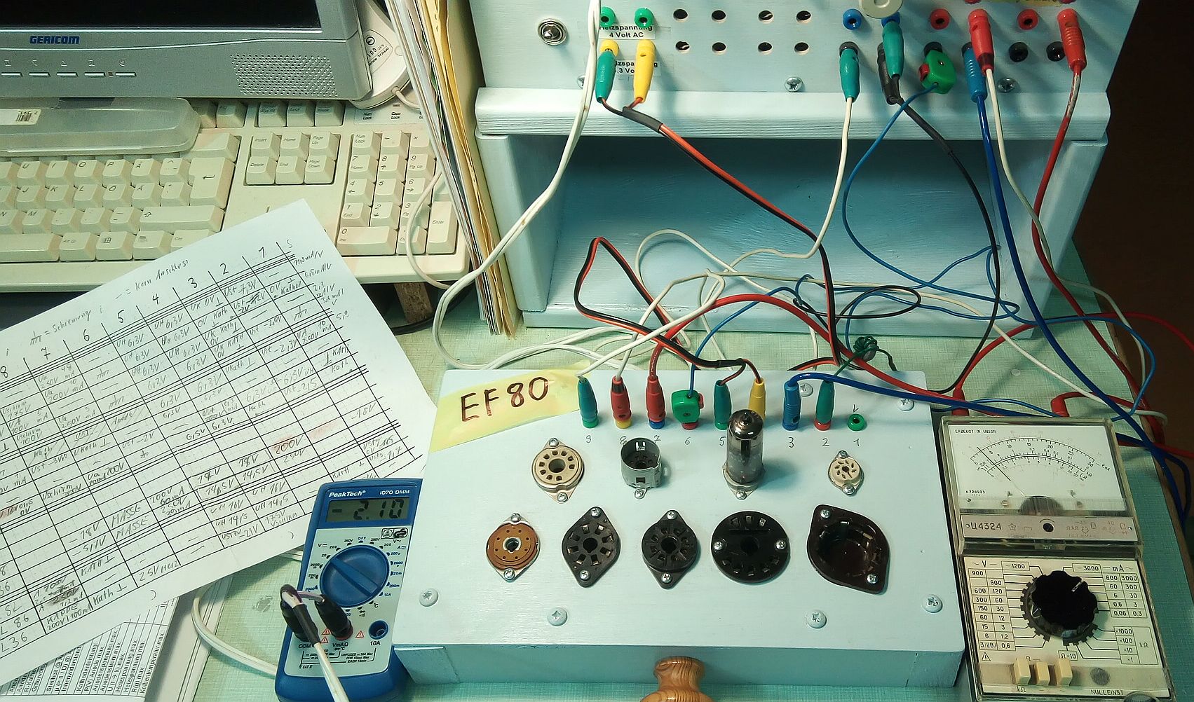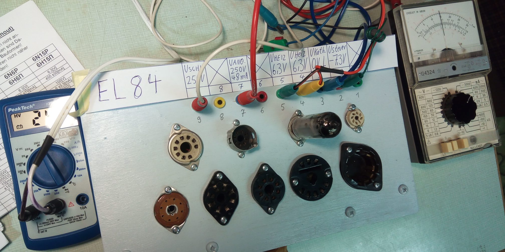 Um die Prüfung zu vereinfachen, habe ich Papierstreifen mit den Röhrendaten eingeführt. Man legt sie einfach hin, was das Stöpseln vereinfacht. Ergonomisch leider nicht perfekt, aber es geht in die richtige Richtung: